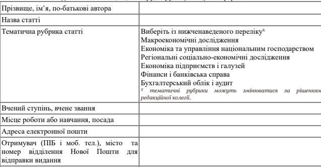 Разом із статтею надсилається АВТОРСЬКА ДОВІДКА у наступній формі*: